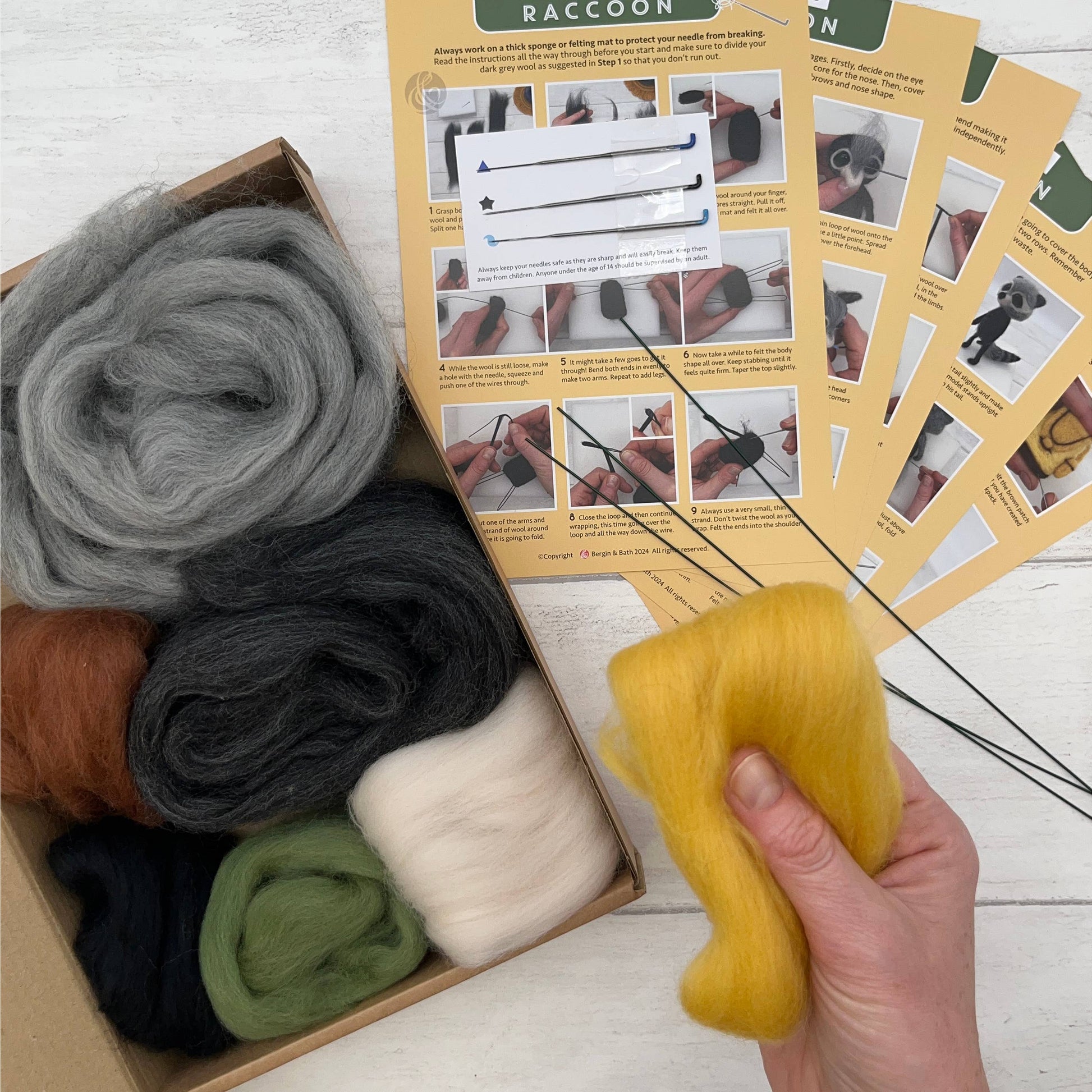 Inside the box you will find lots of cruelty-free natural wool in shades of grey, cream, yellow, green and brown. Plus armature wires to make your creature pose. There are full photographic instruction cards, a needle felting basics guide, a pair of glossy eye pins and three specialist needles.